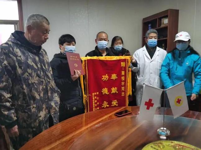 1月11日上午,绍兴市红十字会给屠楼宇的家人颁发荣誉证书,杭州师范大学给他们送上锦旗