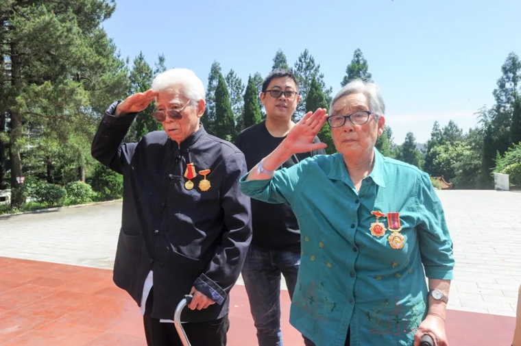 八路军老战士张朝荣与老伴梁树南拄着拐杖,带着儿子、孙子、孙媳和两个重孙女,一家7口来到这里,向长眠于此的革命烈士庄严敬礼、献上鲜花。