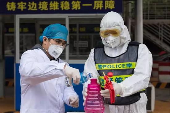 “卫生防控首先要从隔离和消杀病毒做起,当务之急是采购一批防护用品和消杀药剂。”普兴有马不停蹄地跑遍凭祥市各大医院、药店,迅速采购了口罩、消毒液、酒精、紫外线灯等消毒和防护用品,并充分发挥自己在维和期间作为兼职卫生员的优势,每日带领民警配制消毒药剂,对营区和执勤点进行喷洒。每天上勤前,他都会督促民警正确佩戴好各项防疫装具,最大限度的维护民警的身体健康和安全。