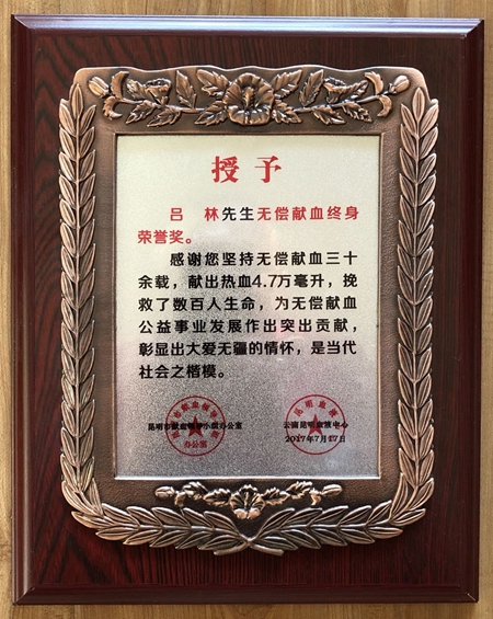 自1987年参与昆明市首次开展的无偿献血活动,一直到2017年他达到《献血法》规定的年龄上限时,吕林坚持献血整整30年。据“昆明市献血领导小组办公室”的官方统计,吕林的“总献血次数:297次”“总献血量:59400ml”。他先后荣获了由国家卫生部、中国红十字总会和原解放军总后勤部共同授予的无偿献血最高奖励“无偿献血金质奖杯”,首届“云南省道德模范”荣誉称号,国家卫健委、中国红十字总会和军委后勤保障部授予的“2016—2017年度全国无偿献血志愿服务终身荣誉奖”等。他还担任了昆明市无偿献血志愿者协会副会长兼无偿献血志愿者服务大队大队长。吕林走遍了云南省的每一个角落宣传无偿献血,举办宣讲活动三十余场。