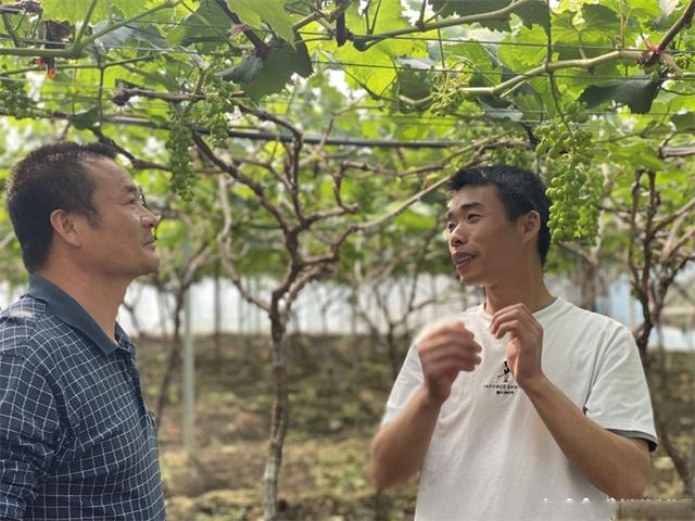 王体斌(右一)向观摩组介绍葡萄基地情况