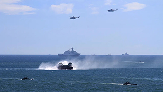 近日,海军陆战队某旅在粤西某地进行了一场登陆演练,演练采取陆、海、空立体协同攻击的方式,对“敌”防御工事和预定目标进行打击。