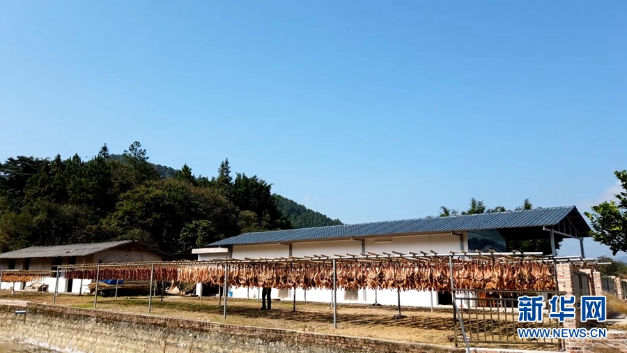 随着春节临近,在广州市北部山区吕田镇,不少村民会于自家房前屋后生晒腊味。新华网发(胡东和 摄)