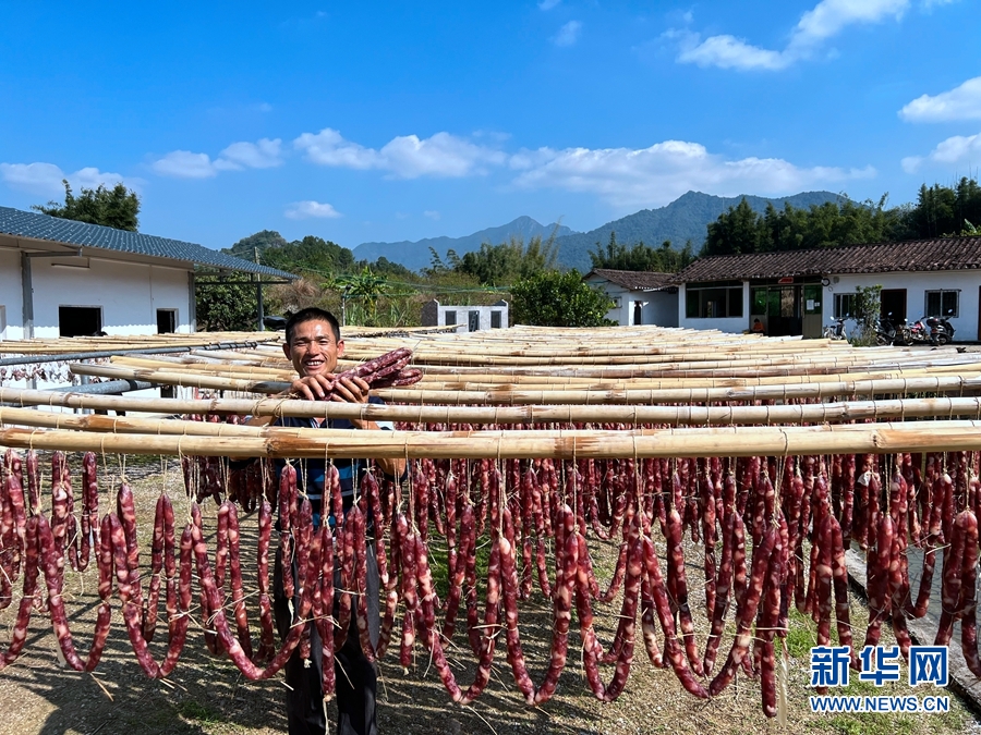 生晒腊味是当地人的传统,村民正在制腊味。新华网发(罗素玲 摄)