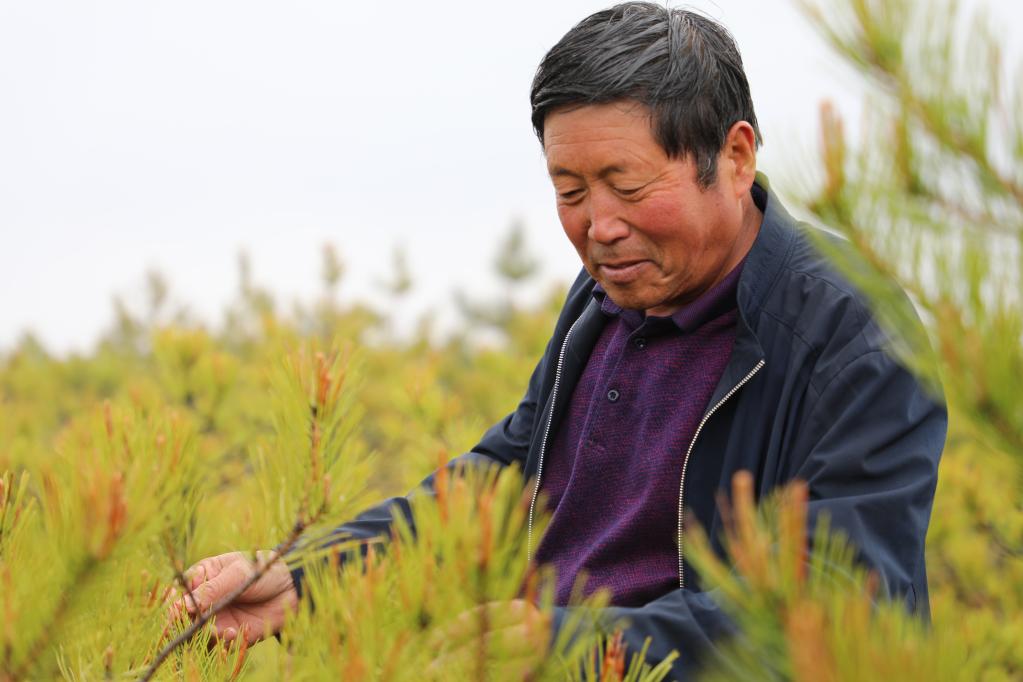 4月15日,吴起群众李文军在自己种植的绿林里看苗木长势。新华社记者梁军摄