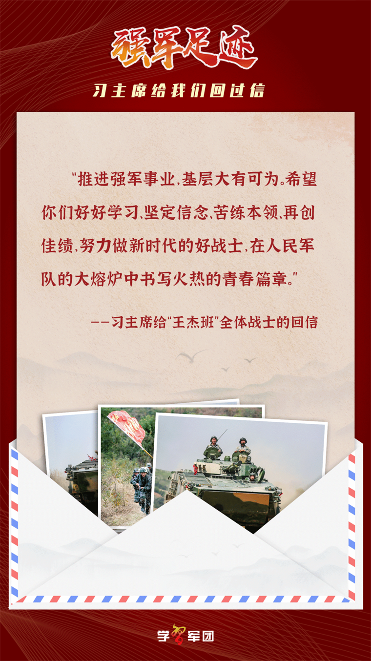 2019年1月21日,习主席给“王杰班”全体战士回信,勉励他们“好好学习、坚定信念、苦练本领、再创佳绩,努力做新时代的好战士,在人民军队的大熔炉中书写火热的青春篇章”。