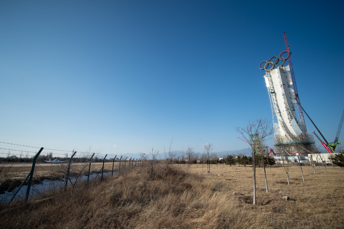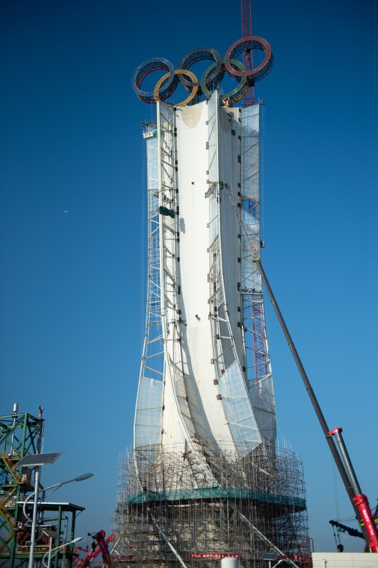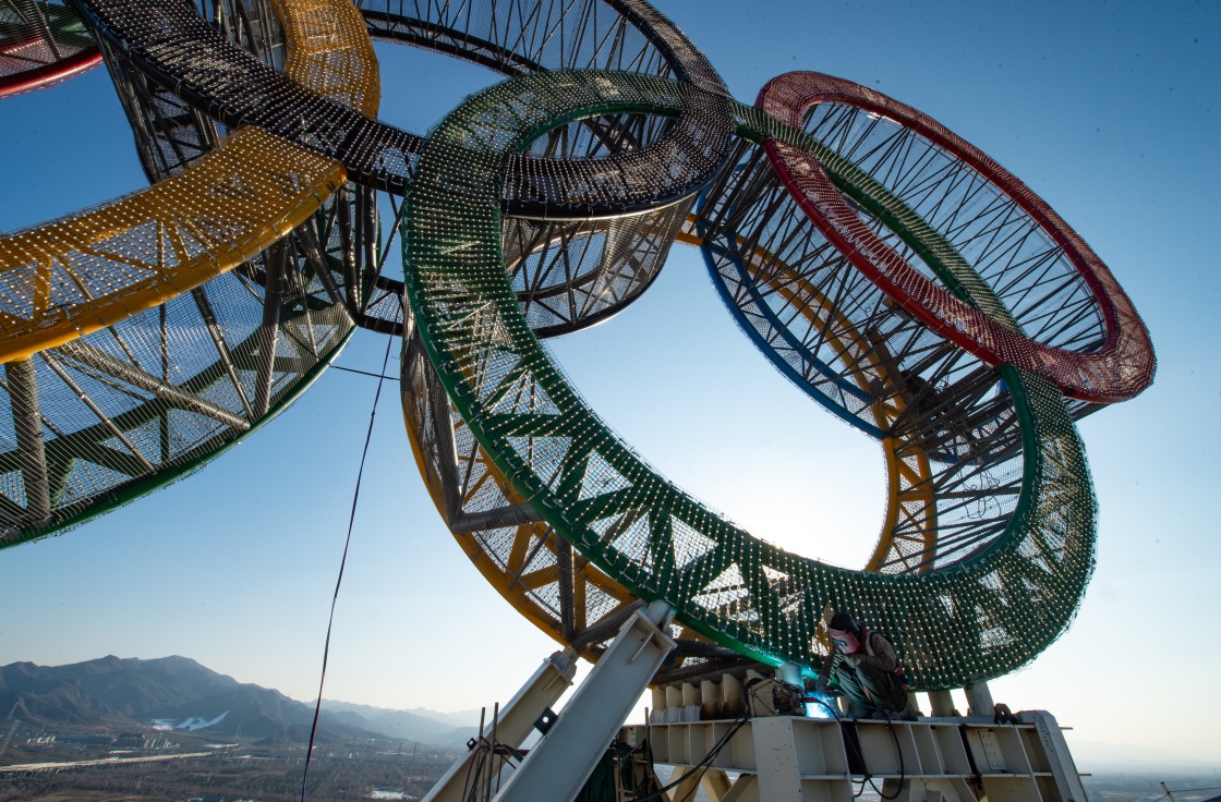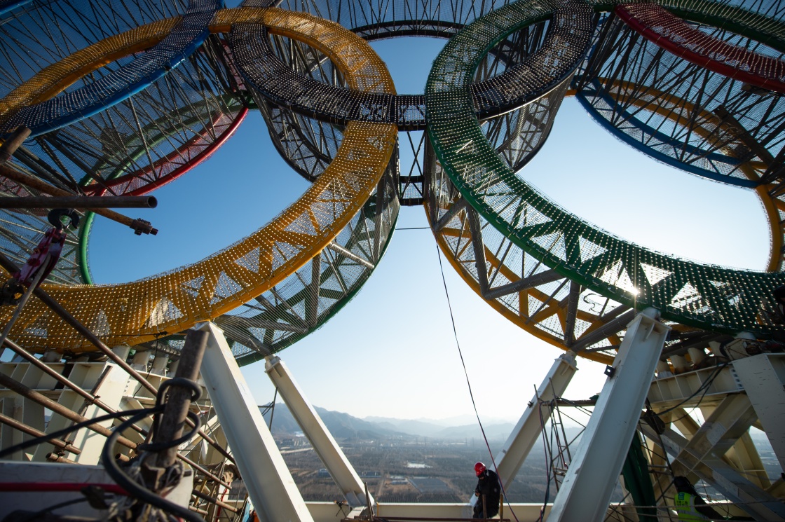 近日,位于北京冬奥会延庆赛区的“海陀塔”上的奥运五环结构吊装作业完成,进入工程收尾阶段。塔顶设置奥运五环标志,表面安装了共计7万余个白色点光源,塔身加装飘带形装饰。