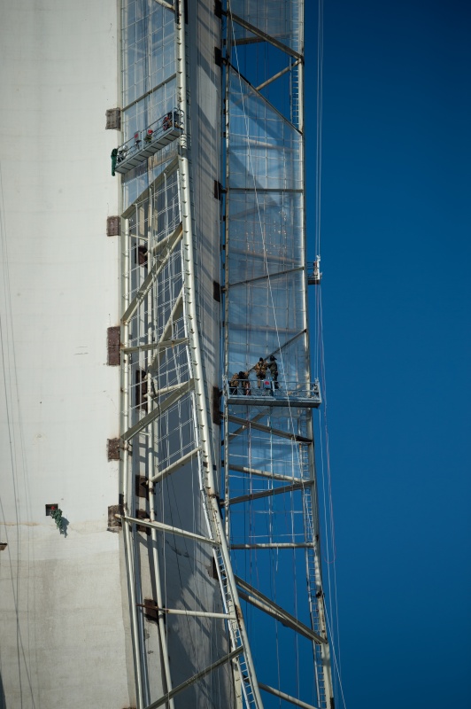 1月11日,工人们乘坐吊篮在奥运五环标志旁作业。
