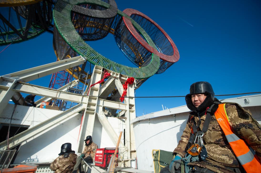1月11日,工人们在“海陀塔”塔顶的奥运五环标志下作业。