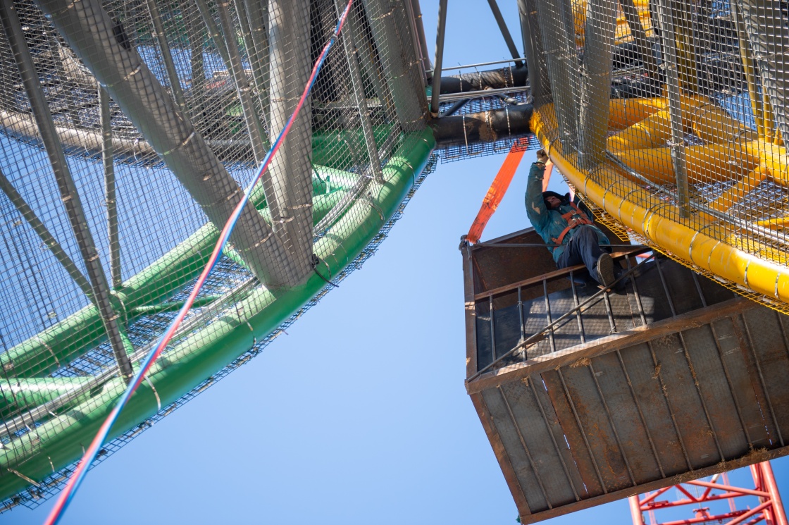 1月11日,工人们加装塔身的飘带形装饰材料。