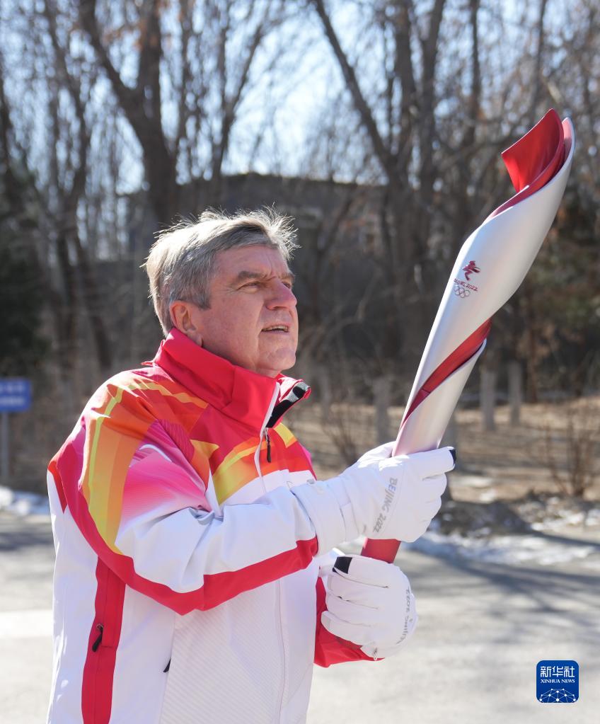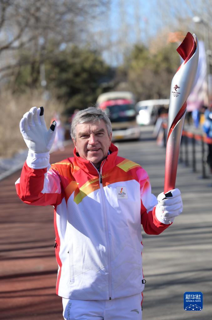 2月4日,国际奥委会主席巴赫在火炬传递中。当日,北京冬奥会火炬在北京奥林匹克森林公园传递。北京2022年冬奥会将于2月4日晚开幕。新华社记者 李贺 摄
