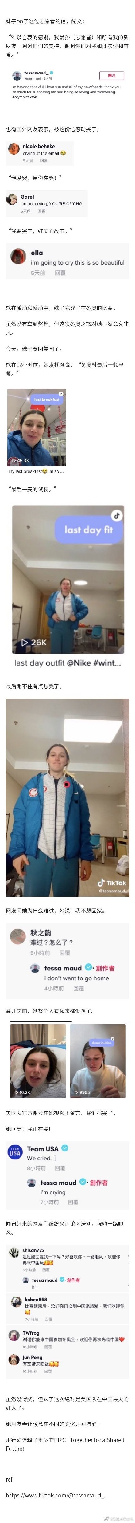 特莎在视频开头介绍自己在中国最后一天的穿着,紧接着说“我很难过”,沉默了几秒又说“我会在飞机上哭的,我要哽咽了,爱你们。”在特莎发布的另一段视频中,冬奥会美国队的官方账号也在留言板中写道“我们哭了”。