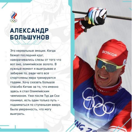俄罗斯奥委会官方网页上发布了在北京冬奥会越野滑雪男子双追逐赛上获得金牌的俄罗斯奥委会代表团选手亚历山大·博利舒诺夫的获奖感言。他说:“有些难以置信,当我滑到最后一圈时我的眼泪瞬间涌出,我拿到了金牌。我想说,感谢中国,让我有机会在此成为奥运冠军。”