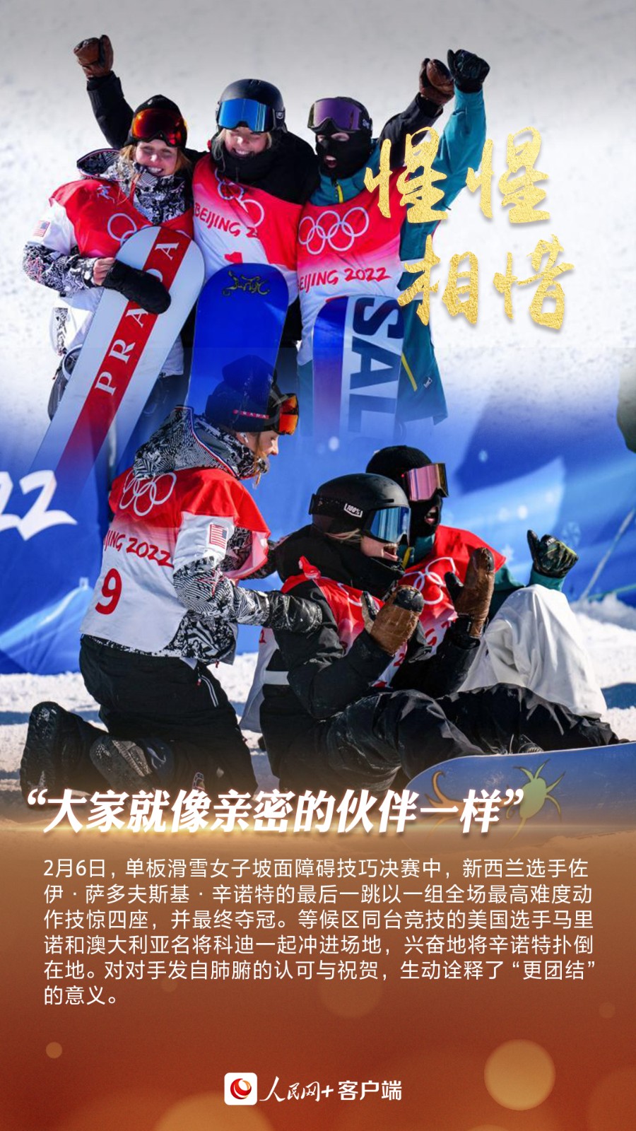 北京冬奥会各项比赛正在火热进行,场上场下那一幕幕温馨动人的场景,是各国运动员和赛事保障人员对“更快、更高、更强——更团结”奥林匹克格言的生动诠释。