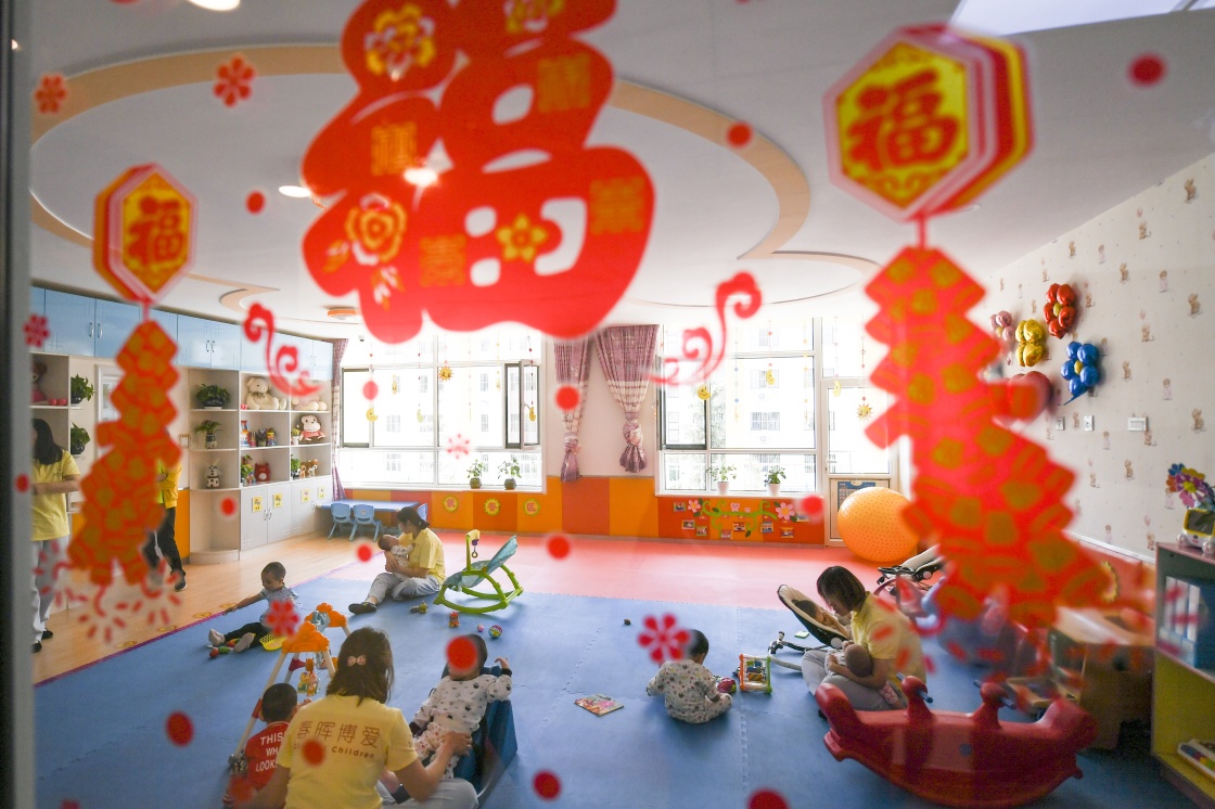 在呼和浩特市儿童福利院,教职工在陪伴儿童们玩耍(2019年5月28日摄)。新华社记者 王靖 摄