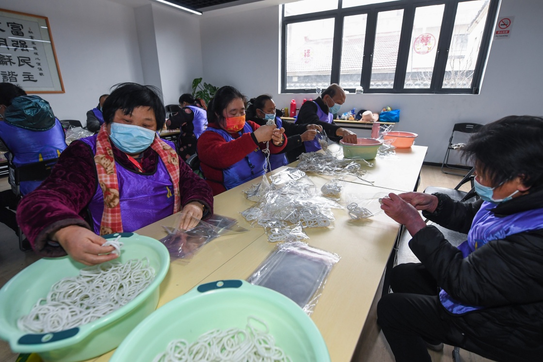 在浙江湖州市织里镇港西村残疾人之家,来自周边的残疾人正在打包配件(2022年2月22日摄)。完成工作后,他们可以获得相应报酬和补贴。新华社记者 徐昱 摄