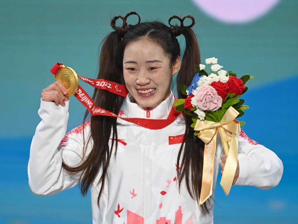 3月6日,获得金牌的中国选手张梦秋在北京冬残奥会高山滑雪女子超级大回转(站姿)比赛颁奖仪式上。新华社记者李嘉南摄