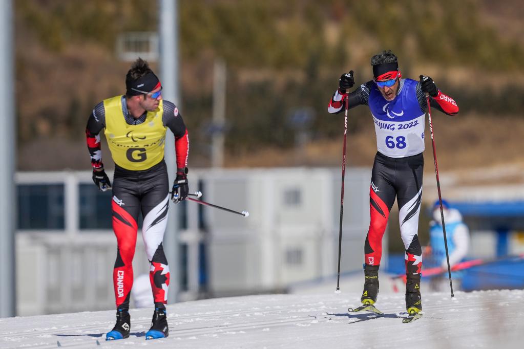 3月7日,加拿大选手布赖恩·麦基弗(右)和他的向导罗素·肯尼迪在北京2022年冬残奥会越野滑雪男子长距离经典视力障碍比赛中。新华社记者胡超摄