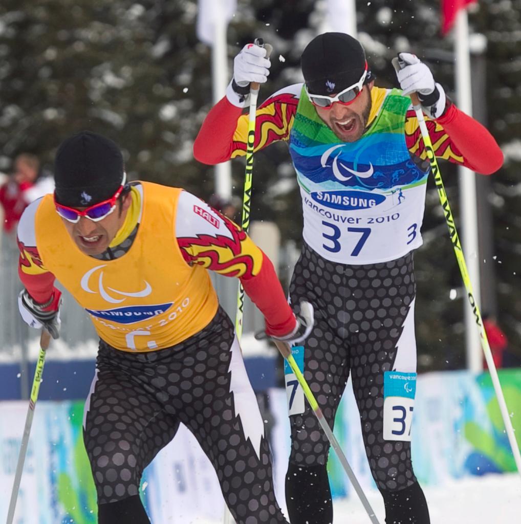 2010年3月15日,加拿大选手布赖恩·麦基弗(右)和他的兄弟兼向导罗宾在2010年冬残奥会男子20公里越野视力障碍比赛中。新华社发
