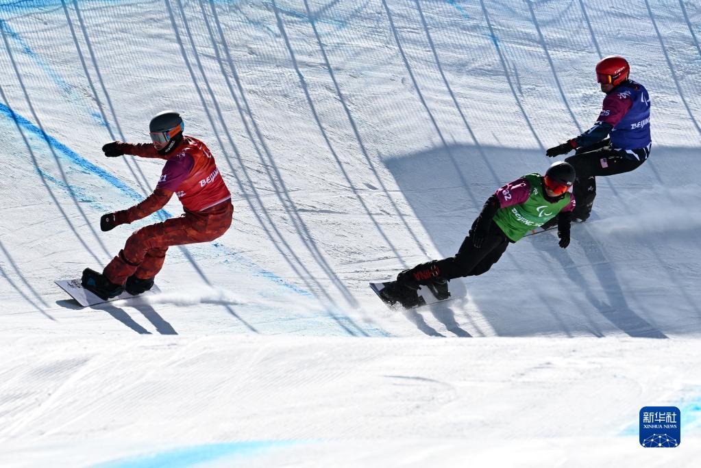 3月7日,中国选手武中伟(中)在北京冬残奥会单板滑雪男子障碍追逐LL1级比赛中,最终他获得季军。新华社记者宋彦桦摄