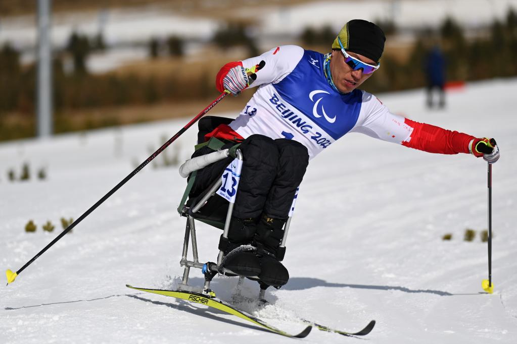 中国选手毛忠武在男子长距离(坐姿)比赛中(3月6日摄)。新华社记者 赵子硕 摄