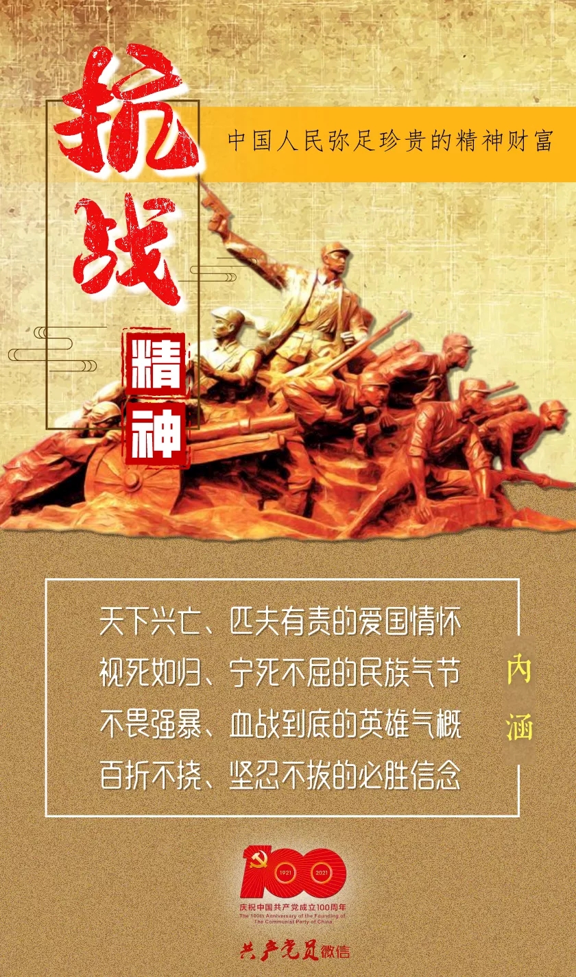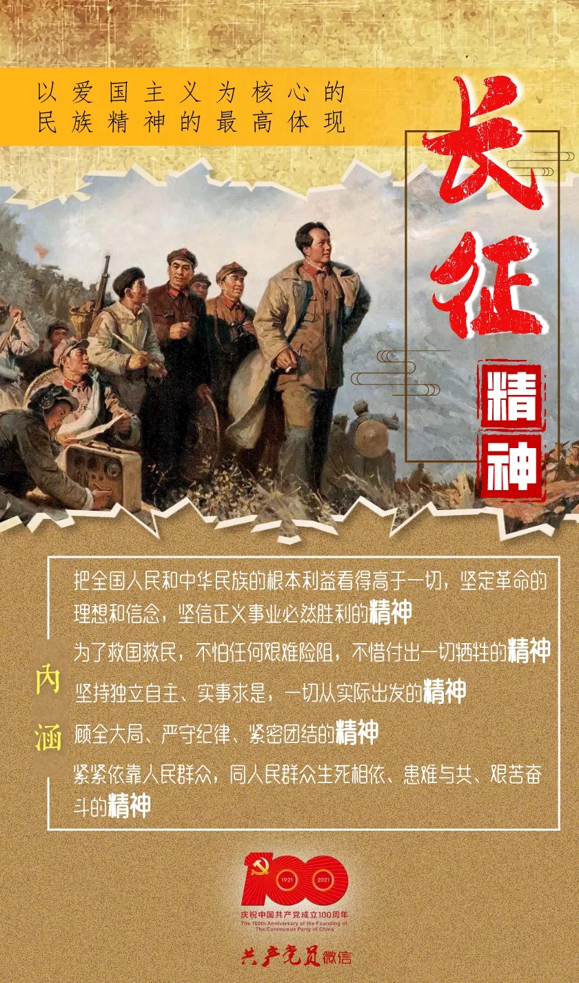 在一百年的非凡奋斗历程中,一代又一代中国共产党人顽强拼搏、不懈奋斗,涌现了一大批视死如归的革命烈士、一大批顽强奋斗的英雄人物、一大批忘我奉献的先进模范,形成了井冈山精神、长征精神、遵义会议精神、延安精神、西柏坡精神、红岩精神、抗美援朝精神、“两弹一星”精神、特区精神、抗洪精神、抗震救灾精神、抗疫精神等伟大精神,构筑起了中国共产党人的精神谱系。