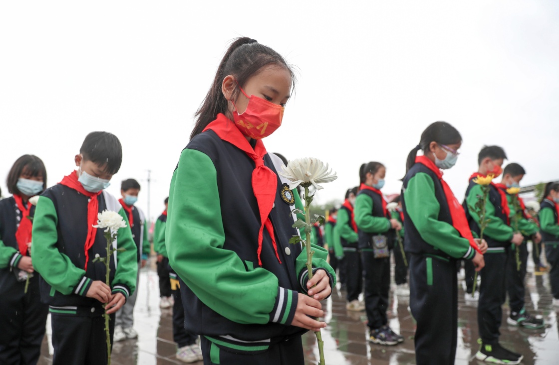 3月31日,秦皇岛市海港区西港路街道玉龙湾社区居民在汤河公园革命英雄纪念碑前默哀。新华社发(曹建雄 摄)