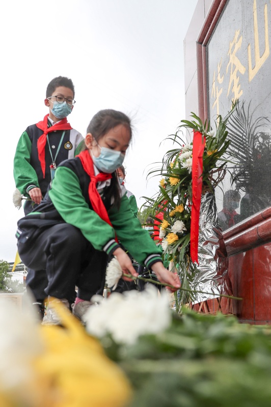 3月31日,四川省华蓥市双河小学的少先队员在红岩广场华蓥山游击队群雕前敬献鲜花,祭奠革命先烈。新华社发(邱海鹰摄)