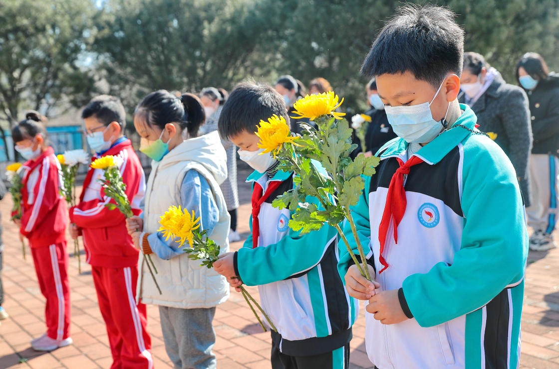 3月31日,秦皇岛市海港区西港路街道玉龙湾社区居民在汤河公园革命英雄纪念碑前献花。新华社发(曹建雄 摄)