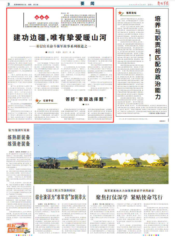 都说“有国才有家”,“家与国”是每一名军人随时可能面对的选择。从军报国,每名军人都得答好自己的“家国选择题”。我们坚信,坚守边疆的“徐祝寿们”,把热血融进祖国的壮丽山河,把青春献给伟大的强军事业,必将在艰苦岗位上历练成长,干出不凡的业绩,绽放夺目的光彩!