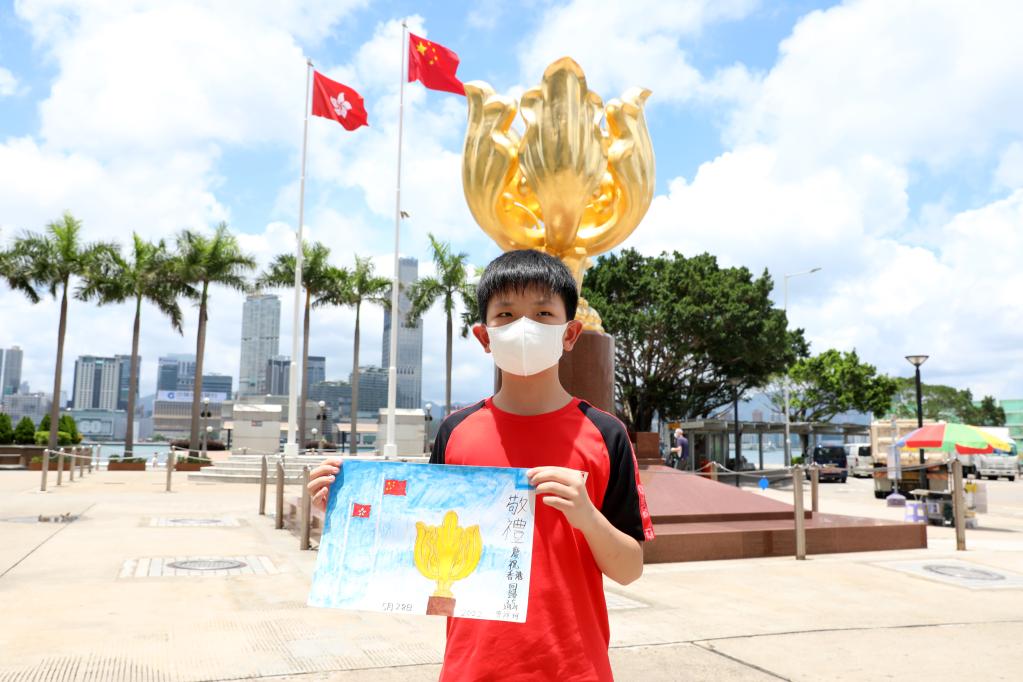 香港小学生曾祥珂带着自己的画作《敬礼——庆祝香港回归25周年》,在父母陪伴下来到金紫荆广场留影,迎接香港回归25周年。新华社记者 吴晓初 摄