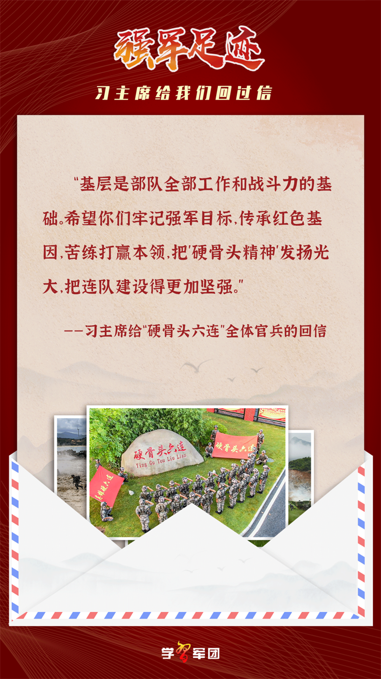 习主席在回信中勉励官兵:“基层是部队全部工作和战斗力的基础。希望你们牢记强军目标,传承红色基因,苦练打赢本领,把‘硬骨头精神’发扬光大,把连队建设得更加坚强。”