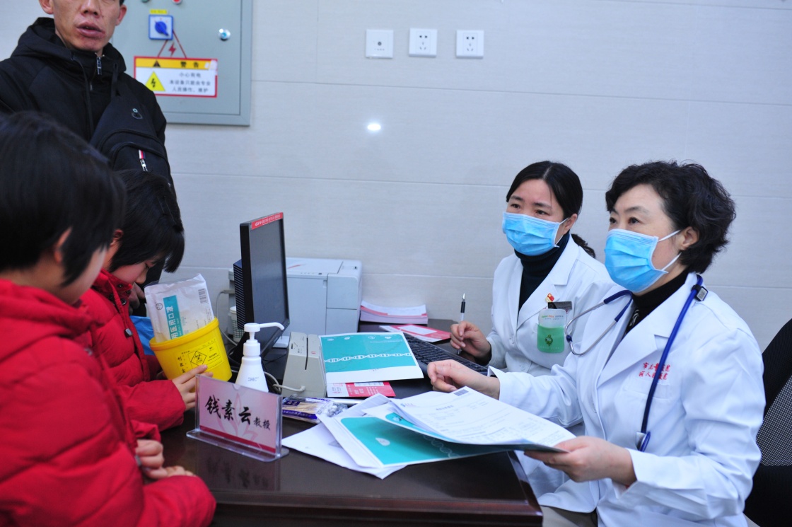 钱素云(右一)在陕西省榆林市儿童医院参与义诊活动(2019年1月摄)。新华社发