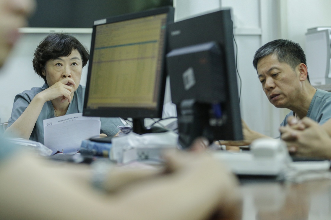 钱素云(左)在办公室参加病例讨论(2019年7月31日摄)。新华社记者 才扬 摄