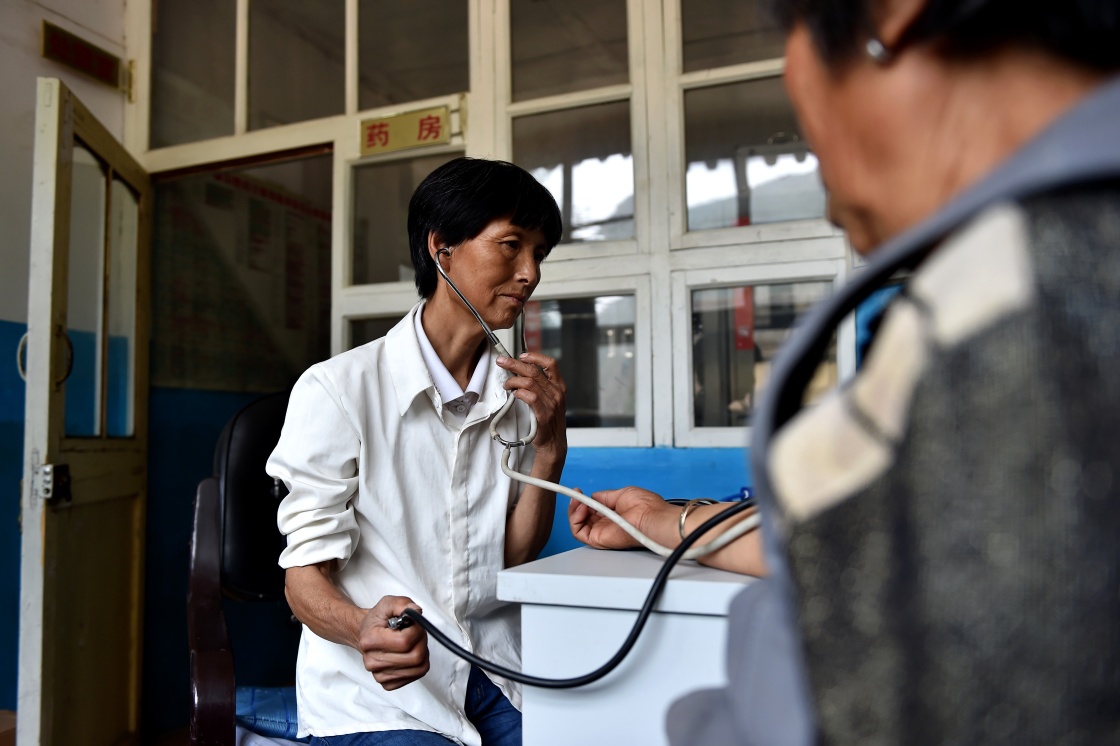 刘桂珍在山西省代县段家湾村卫生所,为一名村民测量血压(资料照片)。新华社记者 詹彦 摄