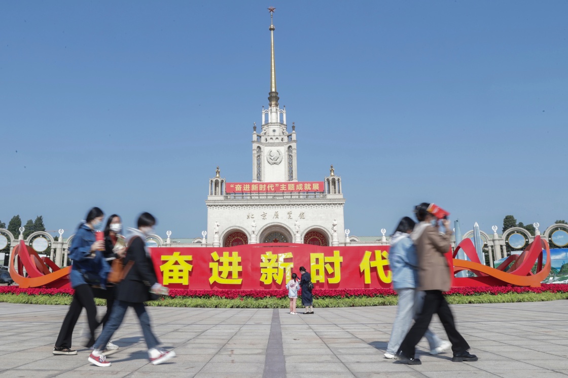 人们在“奋进新时代”主题成就展室外展区参观(2022年10月6日摄)。新华社记者 张玉薇 摄