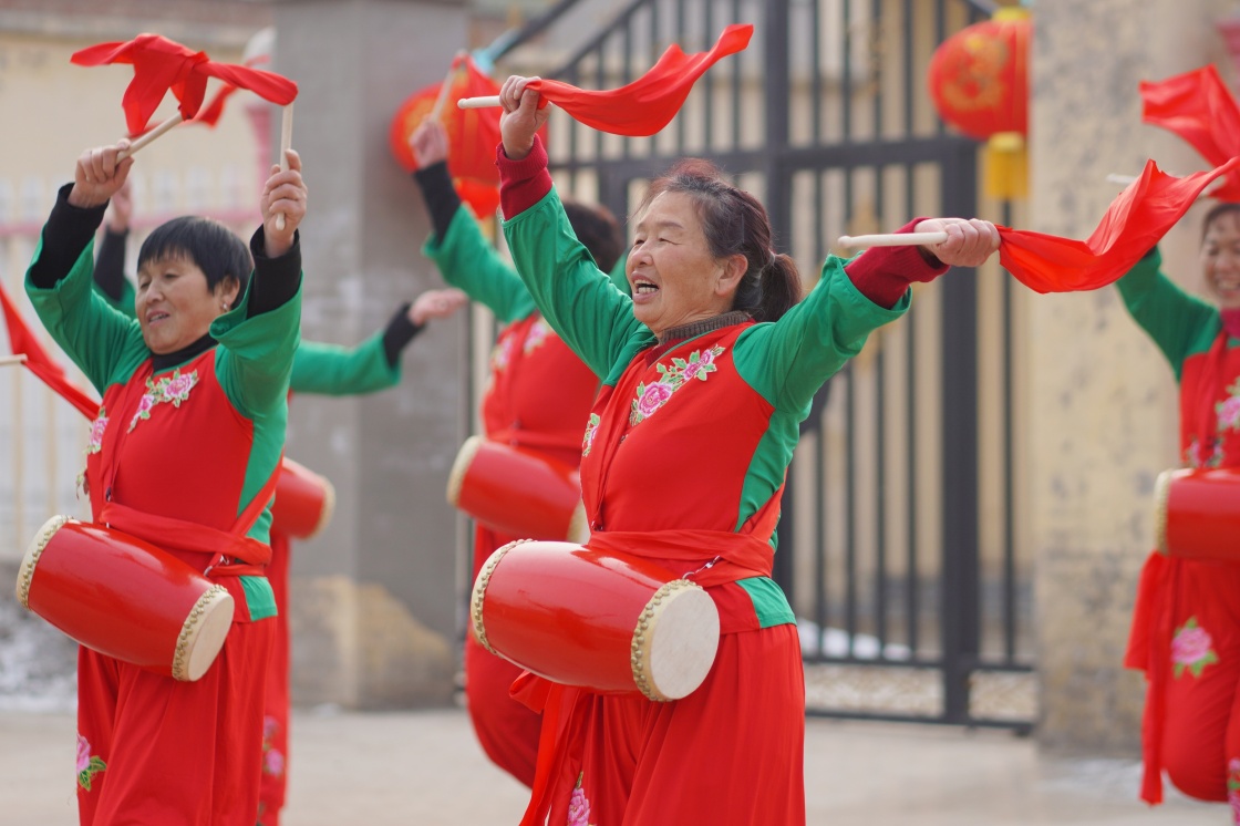 河北省邢台市内丘县史村屯村村民在广场排练腰鼓(2022年1月29日摄)。新华社发(刘继东 摄)