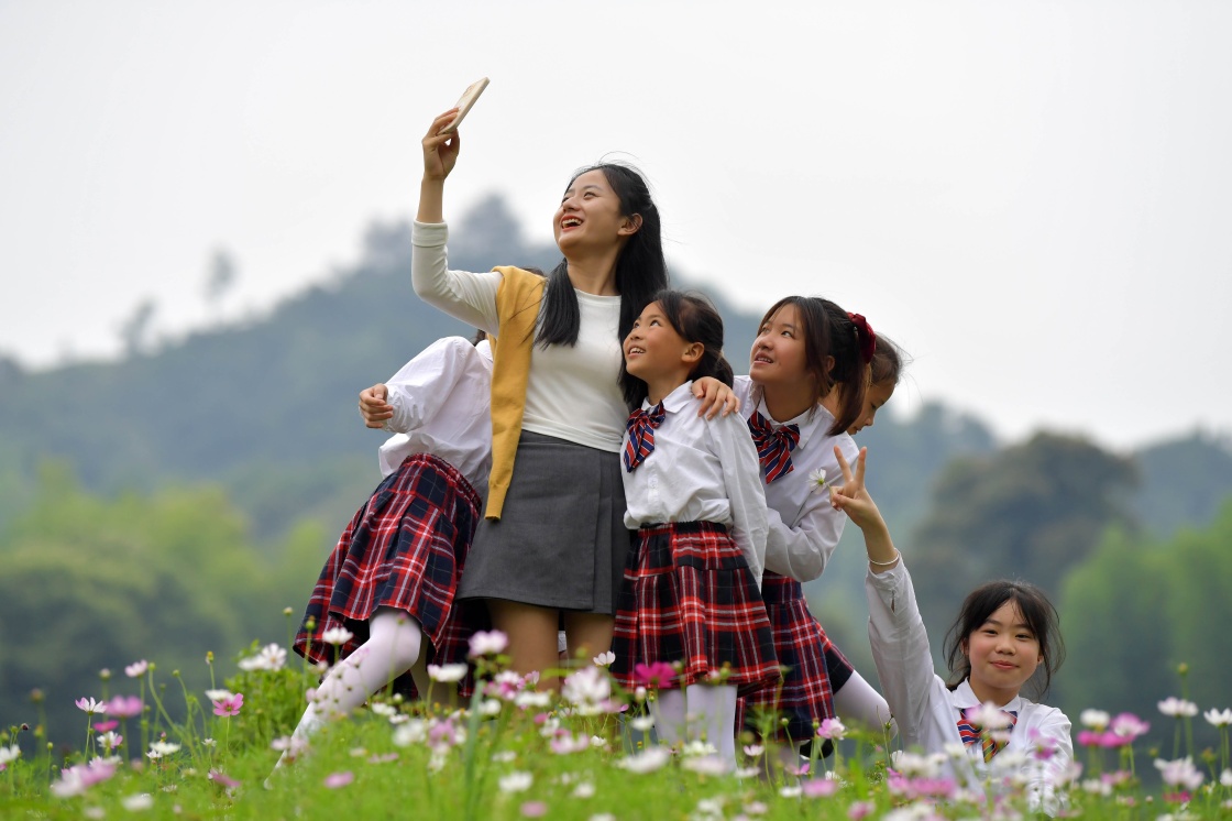 在江西省新余市分宜县洞村乡,老师钟琳珊(左二)带着合唱团的孩子在户外练歌玩耍,合影留念(2022年5月25日摄)。新华社记者 彭昭之 摄
