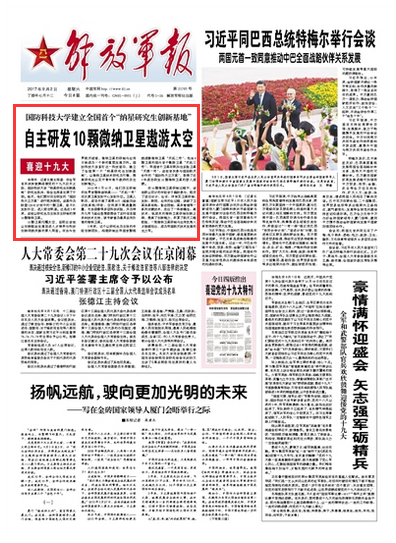 解放军报讯 记者王握文报道:在全军官兵欢欣鼓舞迎接党的十九大召开之际,国防科技大学“纳星研究生创新基地”研究生吴帅、陈全也浑身充满了干劲。每天,他们要对自主研发的“国防科大立方星”进行两次测控。该星作为欧盟QB50计划中的一颗卫星,前不久发射升空,进入预定轨道。这是近5年来,该校以研究生为主体自主研制的第10颗微纳卫星。