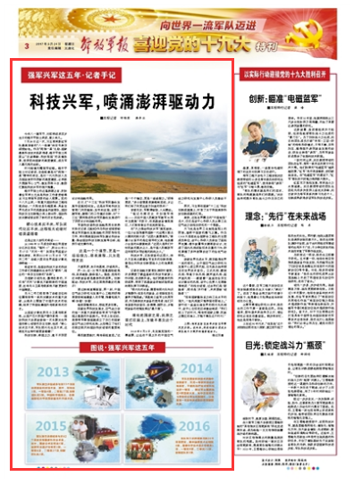 党的十八大以来,一批重大国防科技工程相继启动,一大批信息化程度高、具备世界先进水平的武器装备列装部队,国防科技自主创新能力再上新台阶,国防科技关键领域实现了新的历史性突破。请关注今日出版的《解放军报》“喜迎党的十九大”特刊——