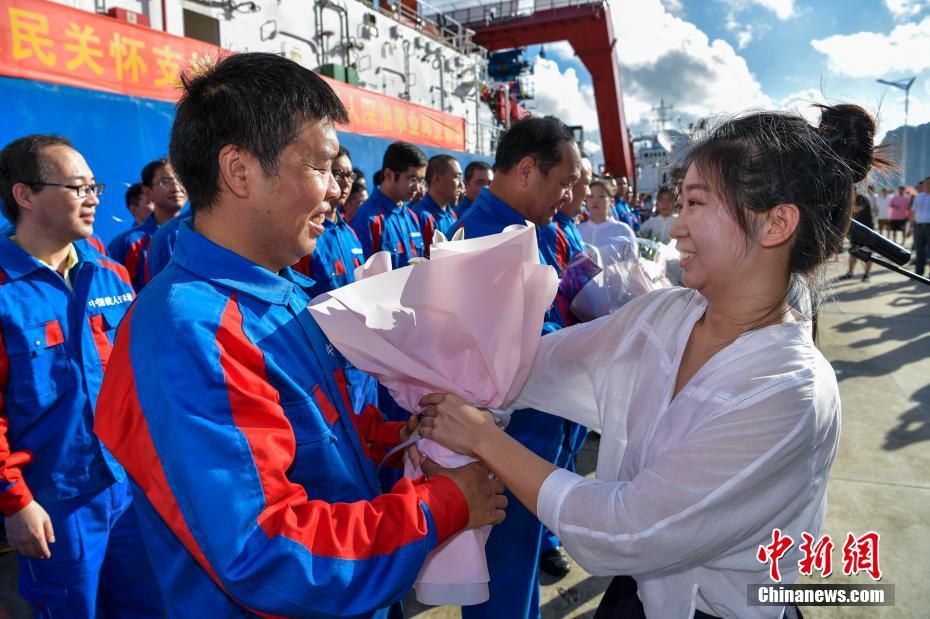 “深海勇士”号载人深潜试验队由中国科学院深海科学与工程研究所牵头,来自中国的19个企事业单位的112名队员和“探索一号”载人潜水器支持母船、“中国海监2168”警戒船共同组成。图为志愿者为“深海勇士”号载人深潜试验队队员献花。 骆云飞 摄