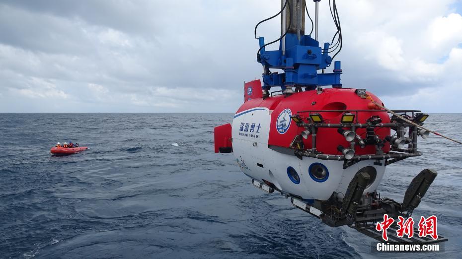 8月中旬拍摄的载人潜水器(右)和“蛙人”。 中新社记者 张素 摄