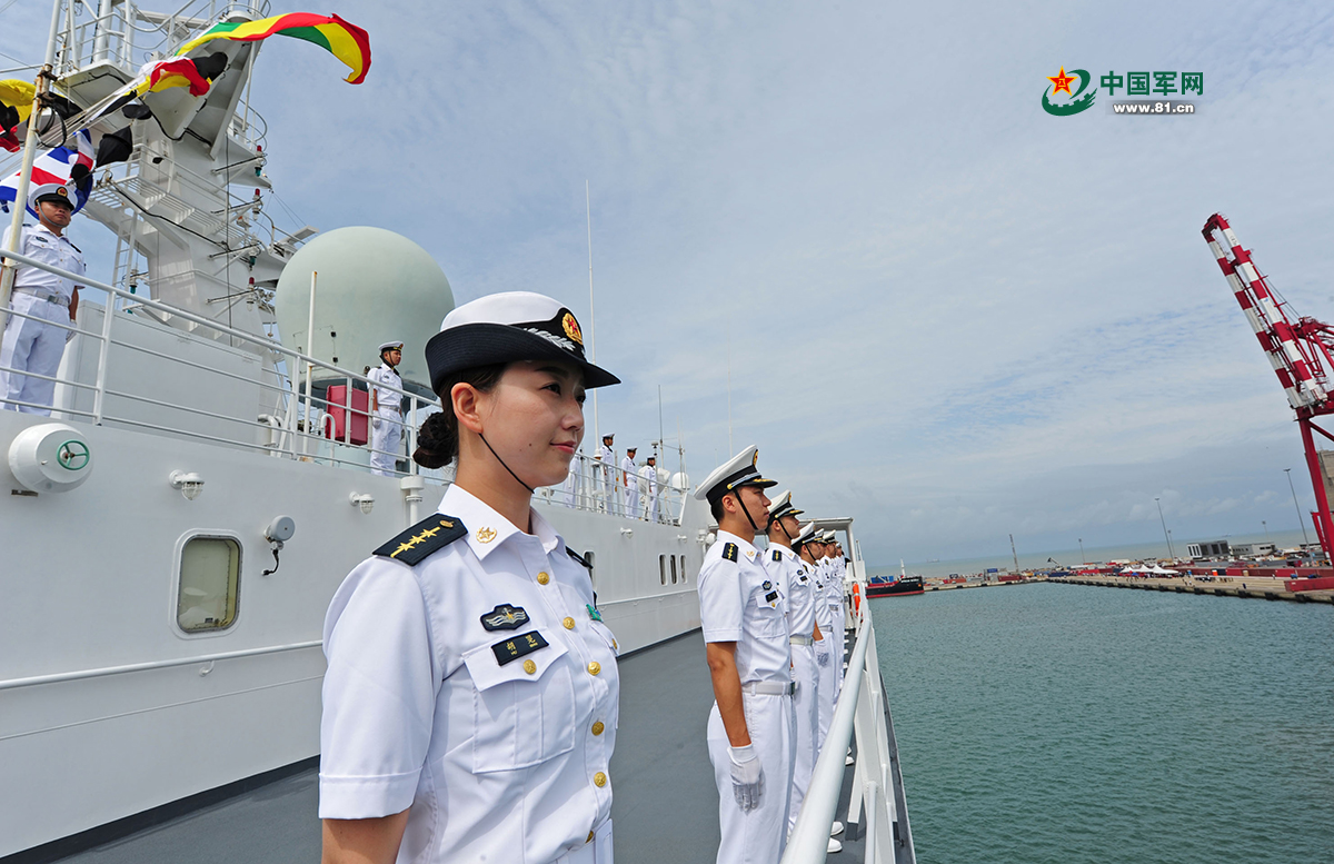当地时间10月10日,中国海军和平方舟医院船缓缓驶进刚果(布)黑角港时,海军官兵在甲板列队站坡。中国军网特约记者江山 摄