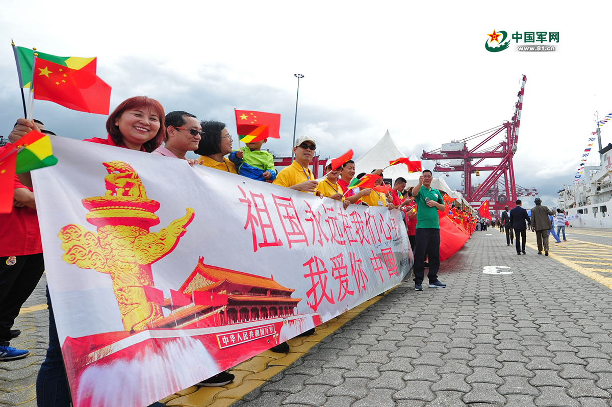 当地时间10月10日,在刚果(布)黑角港码头,欢迎人群挥动中刚两国国旗并拉着“祖国永远在我们心中,我爱你,中国!”的横幅,欢迎中国海军和平方舟医院船首次到访。中国军网特约记者江山 摄