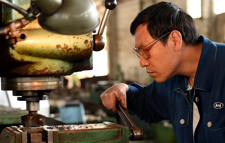云南冶金昆明重工有限公司首席技师耿家盛在车间里操作铣床(2016年4月22日摄)。新华社记者蔺以光 摄