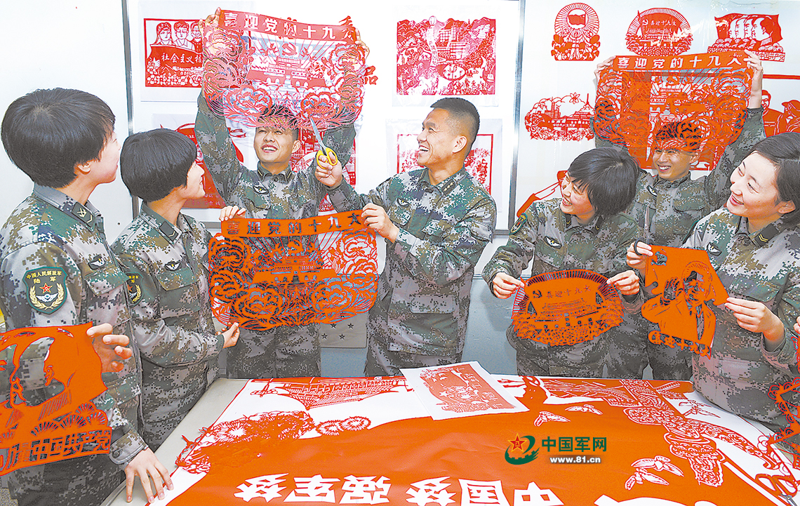 10月12日,陆军第79集团军某旅组织官兵创作剪纸作品,营造浓厚政治文化氛围,迎接党的十九大胜利召开。 解放军报特约记者 谭长摄