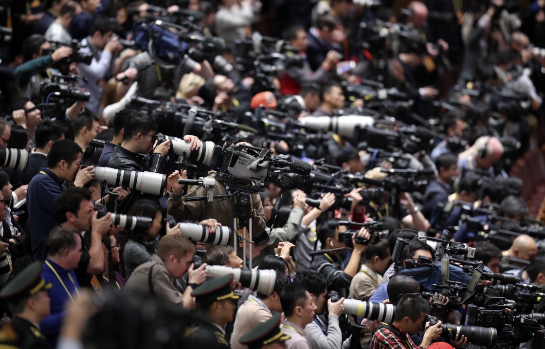 10月18日,中国共产党第十九次全国代表大会在北京人民大会堂隆重开幕。这是记者现场采访。 新华社记者 丁林 摄