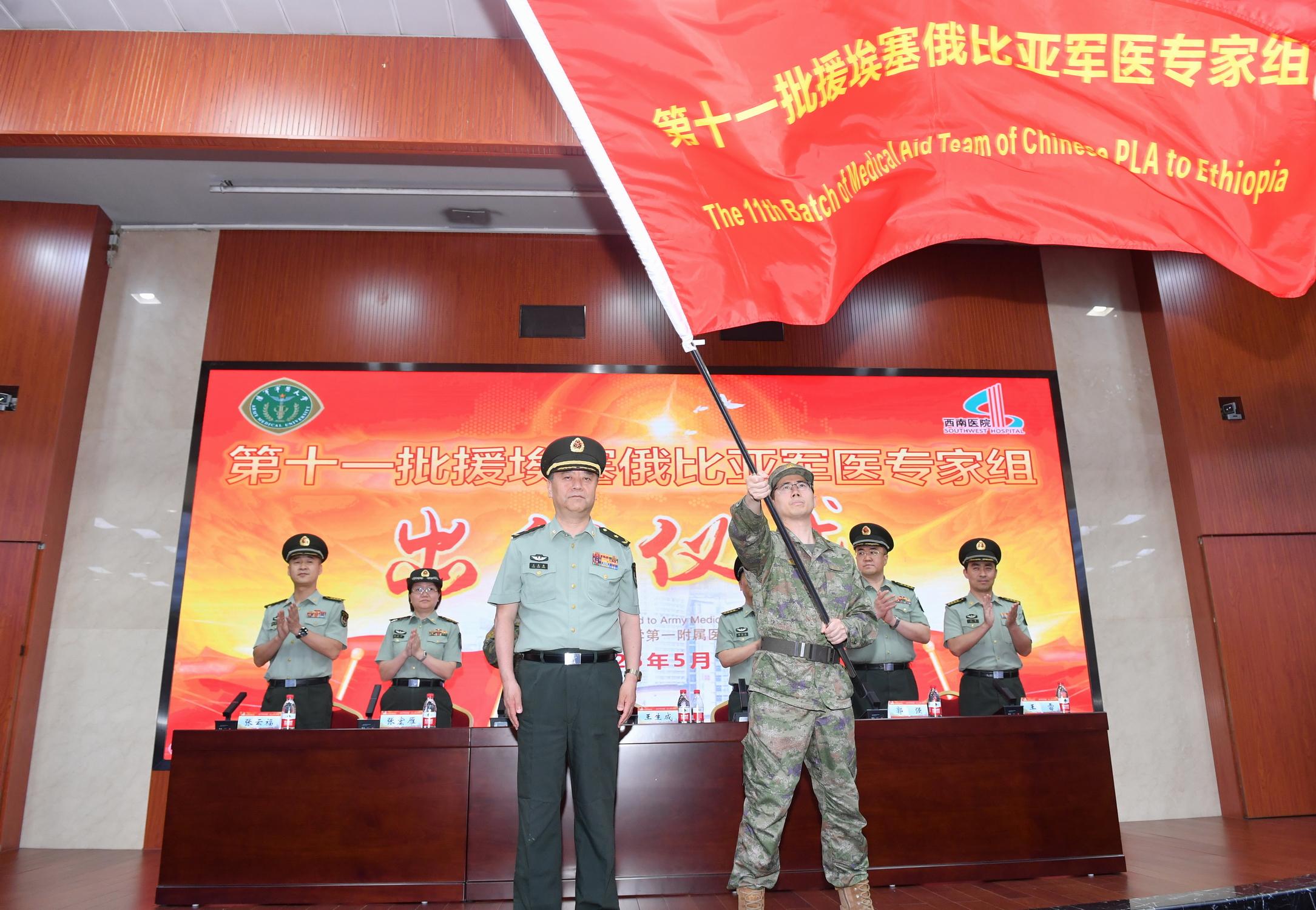 陆军军医大学为中国第11批援埃塞俄比亚军医专家组举行出征仪式。(魏红平摄)