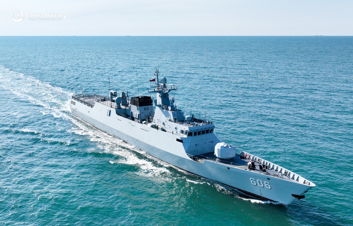 Type 056A corvette Xinji (Hull 606) attached to a frigate flotilla of the navy under the Chinese PLA Northern Theater Command sails on the sea during a maritime training exercise on September 8, 2025. (eng.chinamil.com.cn/Photo by Wang Guangjie)