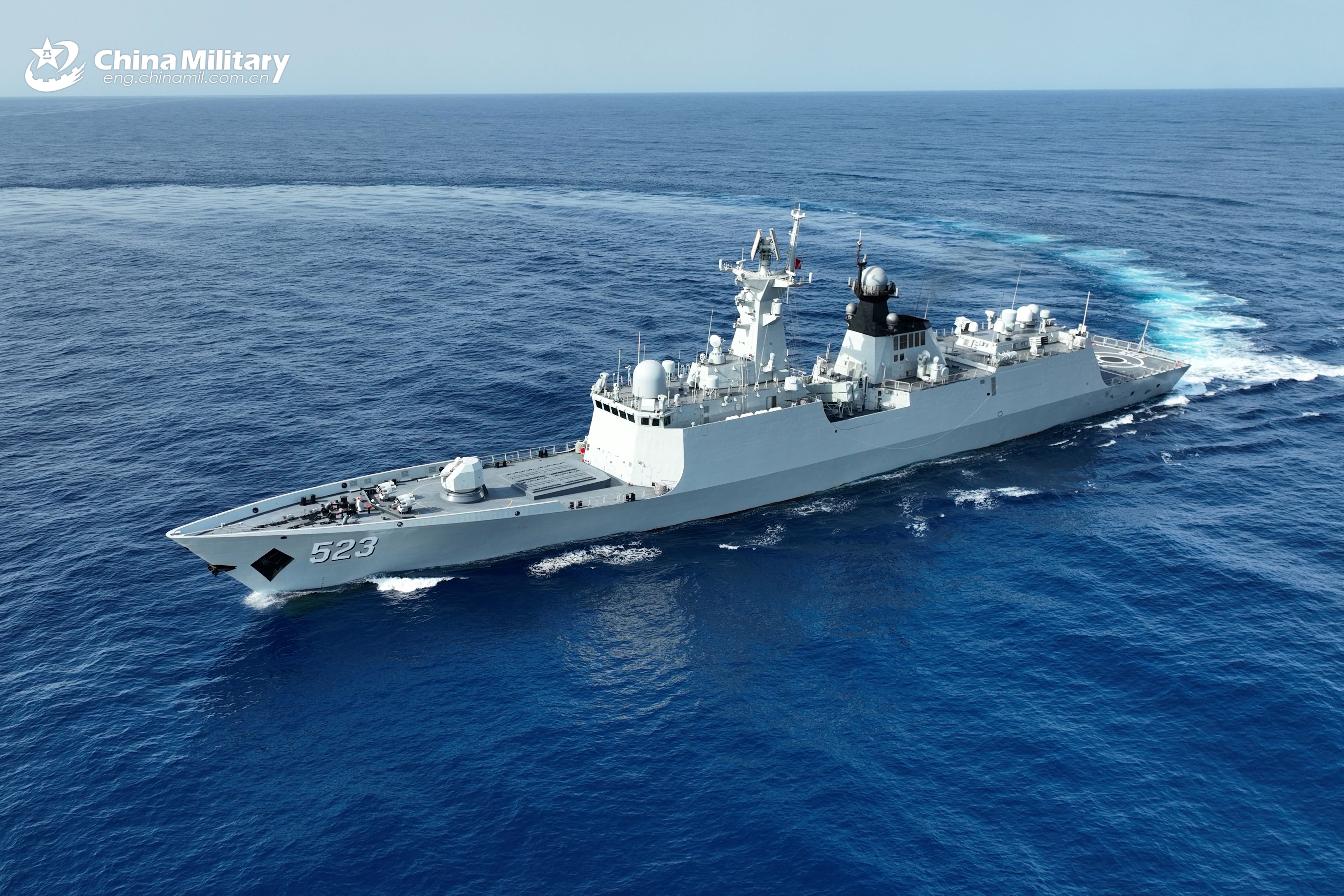 Guided-missile frigate Honghe (Hull 523) attached to the 47th Chinese naval escort taskforce maneuvers at sea during a recent multi-subject training exercise in the Gulf of Aden. (eng.chinamil.com.cn/Photo by Li Zhengcao) 近日,海军第47批护航编队在亚丁湾海域利用护航间隙,展开主副炮对海射击、舰载直升机飞行等多课目训练,检验实战化水平,锤炼官兵打赢本领。(英文中国军网/李政操 摄)